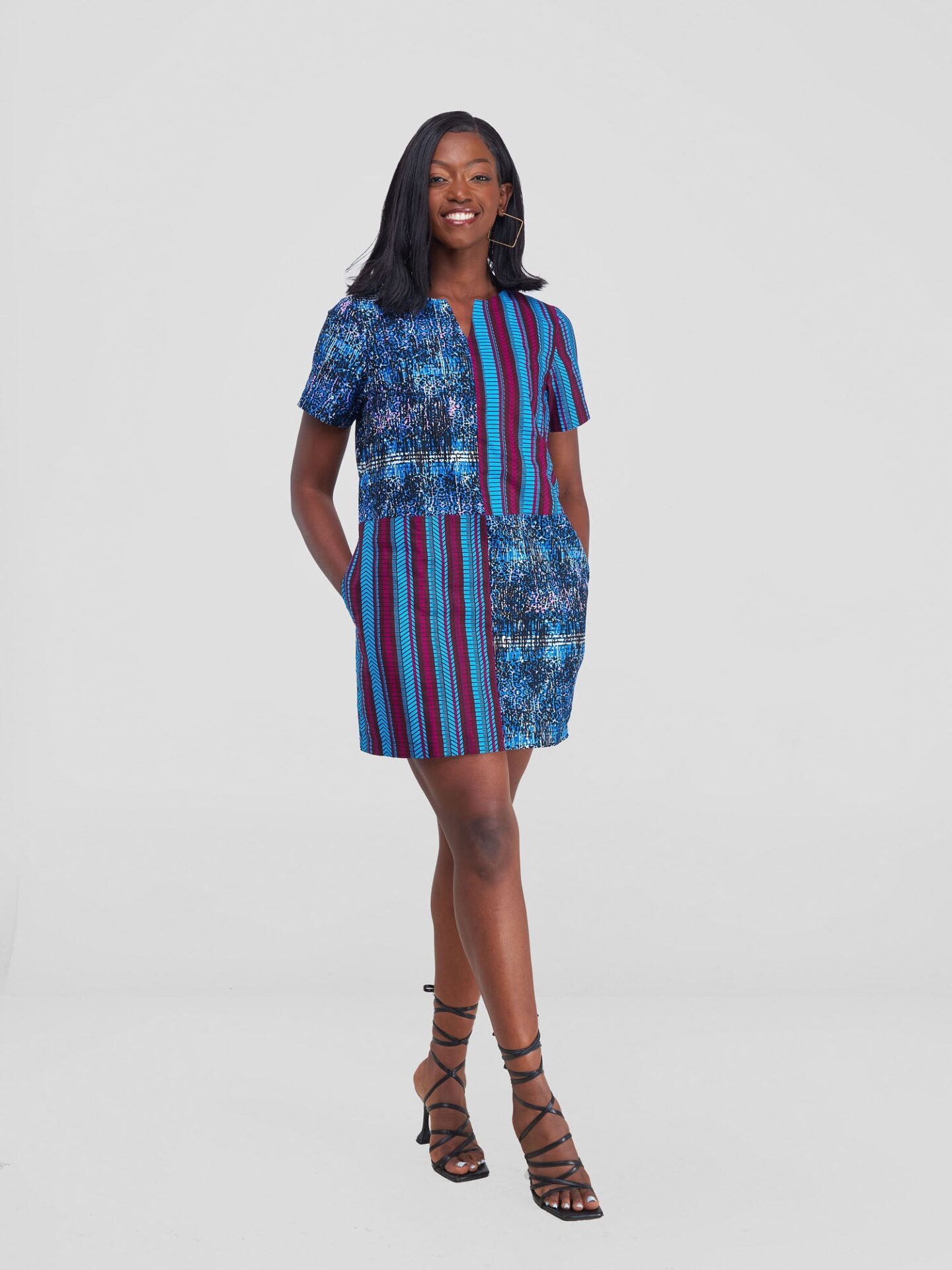 The Tribal Stripes Pocket Mini Dress is a versatile piece that brings together bold Kitenge prints and a flattering A-line silhouette. Featuring striking blue and red striped patterns, this dress is ideal for casual outings, summer parties, or vacation adventures. The side pockets add functionality, while the short sleeves and mini length keep it fresh and contemporary. Style it with strappy heels for a polished look or sneakers for casual charm.