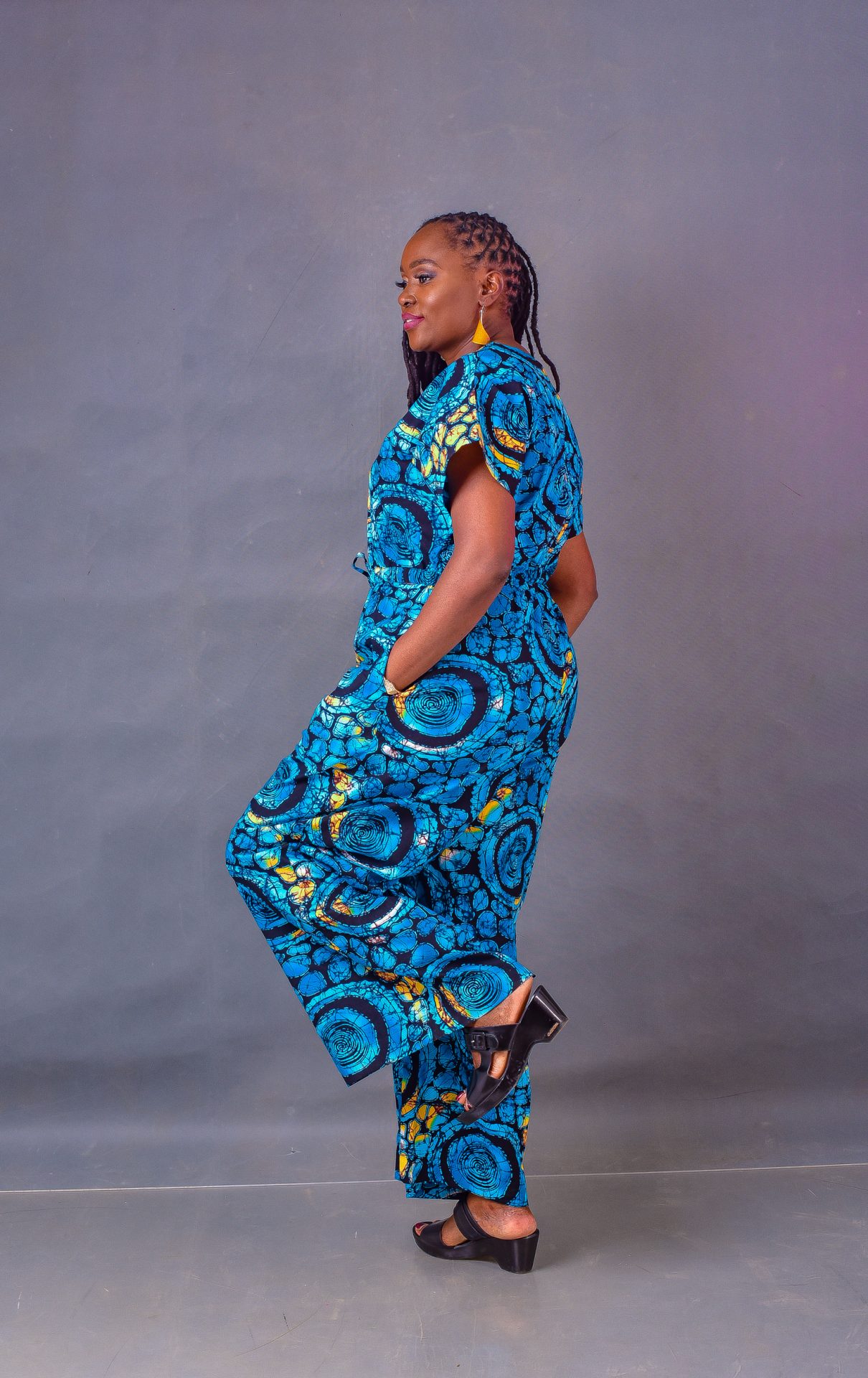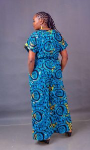 Wide-leg jumpsuit featuring a mesmerizing African print. It’s comfortable, bold, and absolutely impossible to ignore.