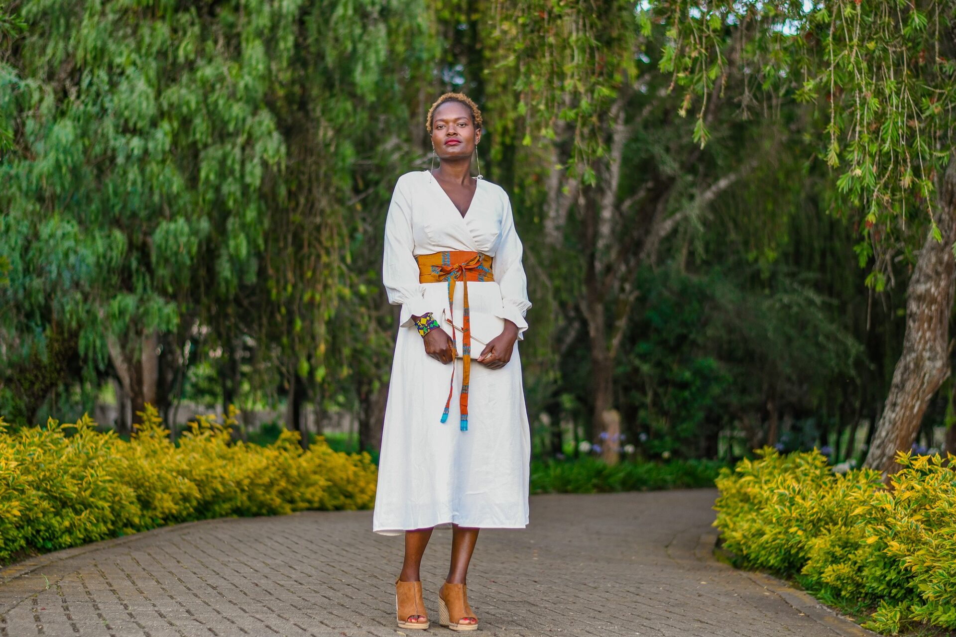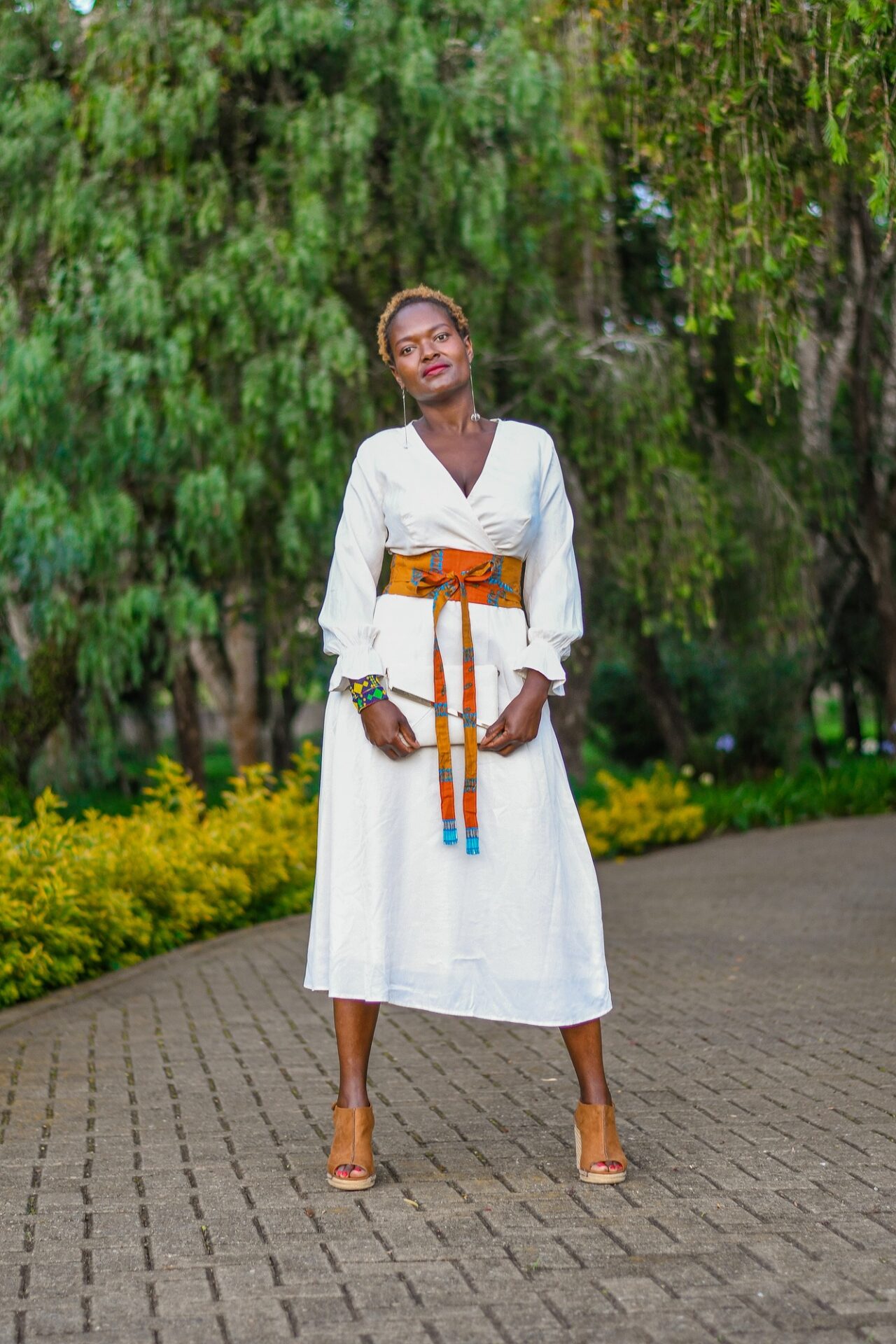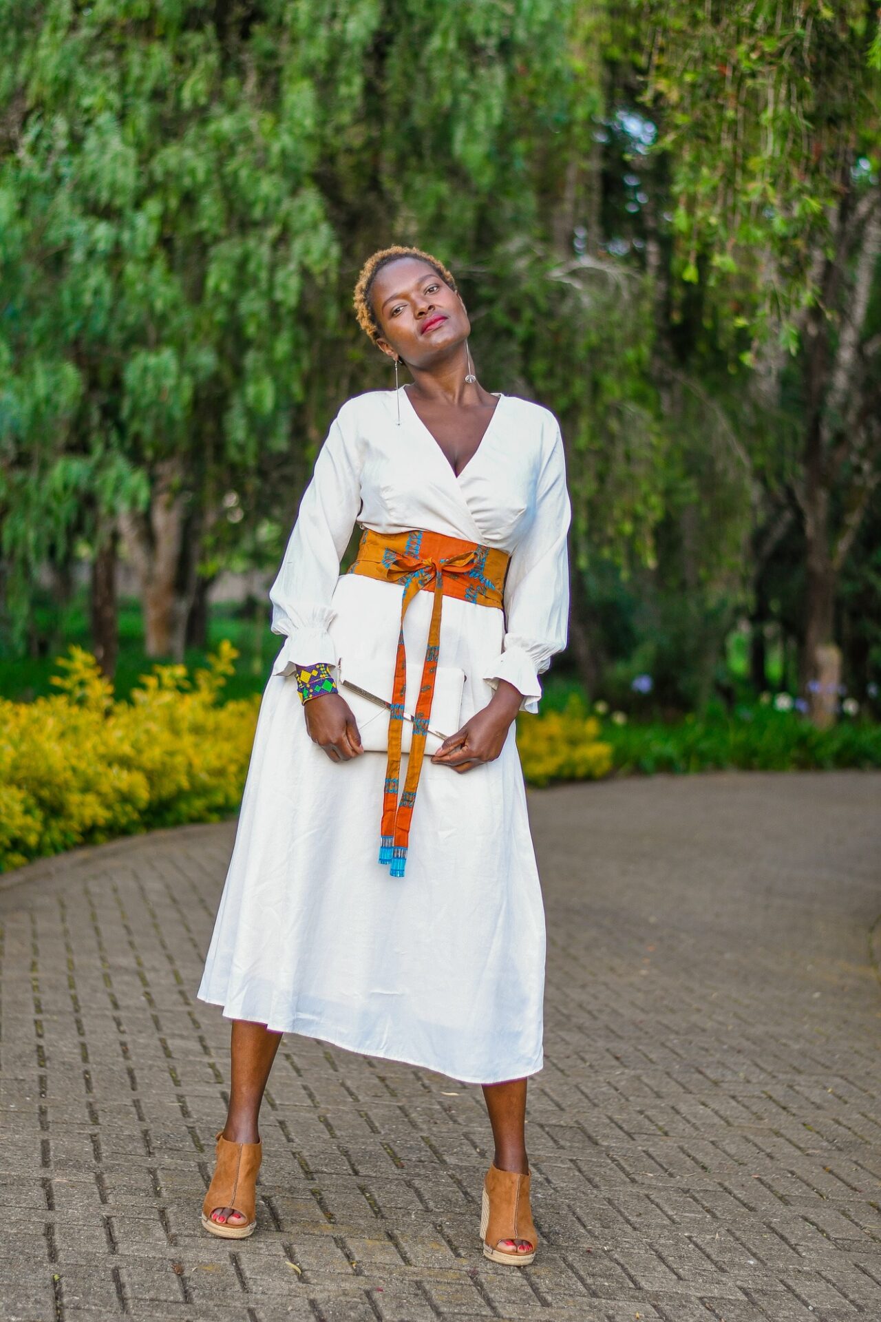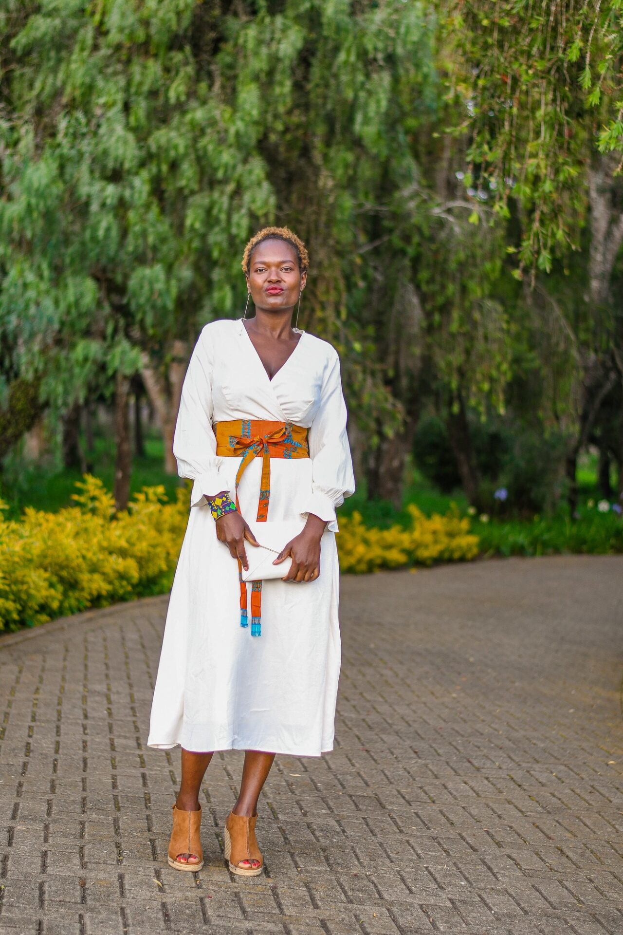 A sophisticated white wrap dress with Kitenge belt accents.