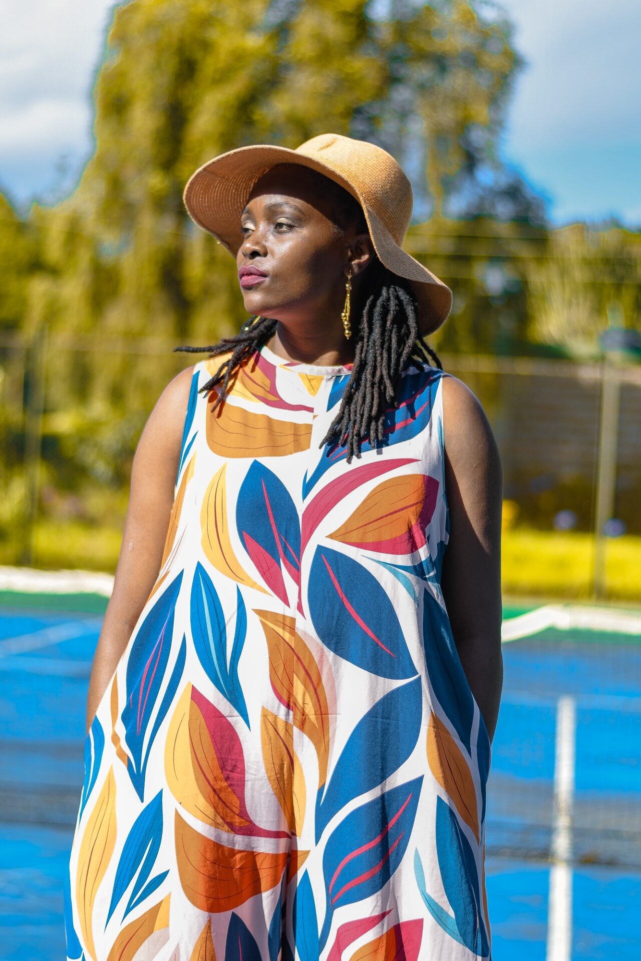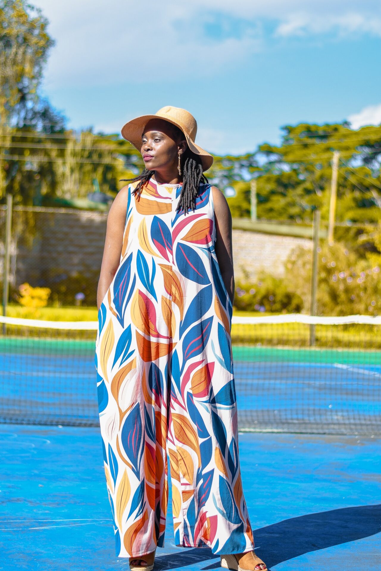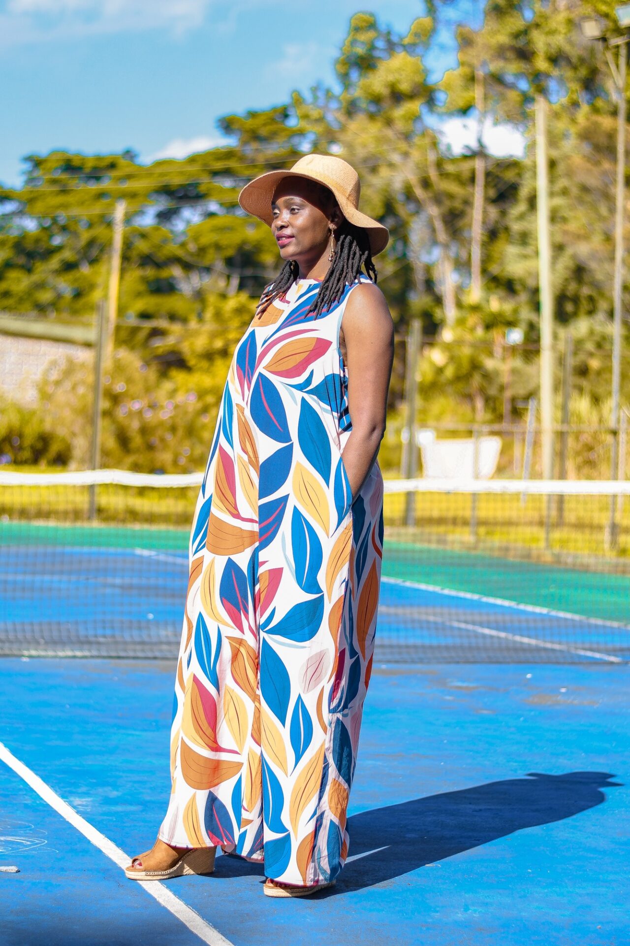 A sleeveless maxi dress with colorful leaf patterns, ideal for casual or formal settings.