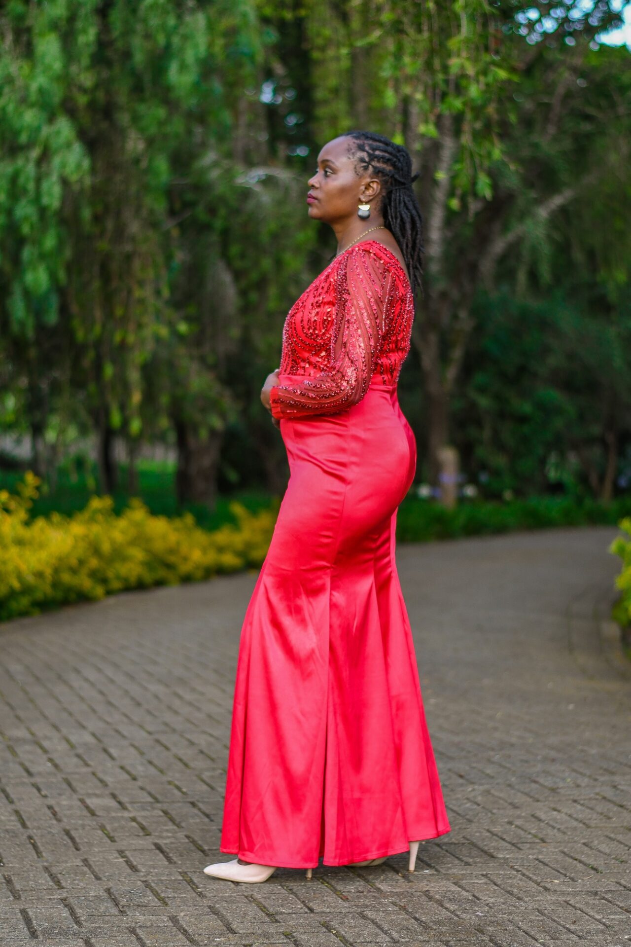 A radiant scarlet gown with intricate beadwork, perfect for formal occasions.