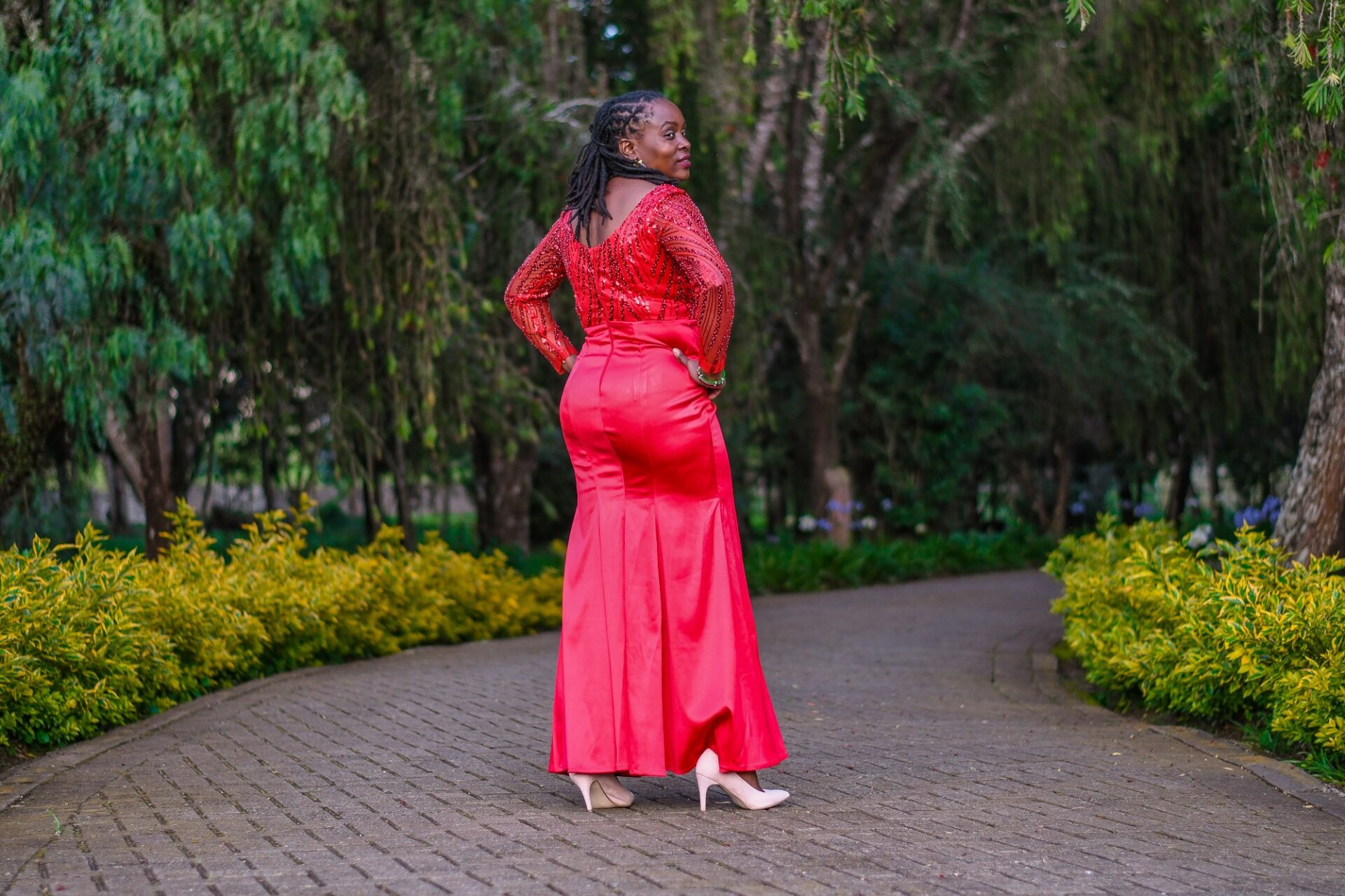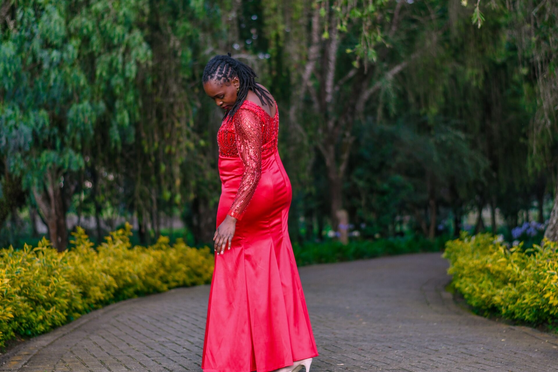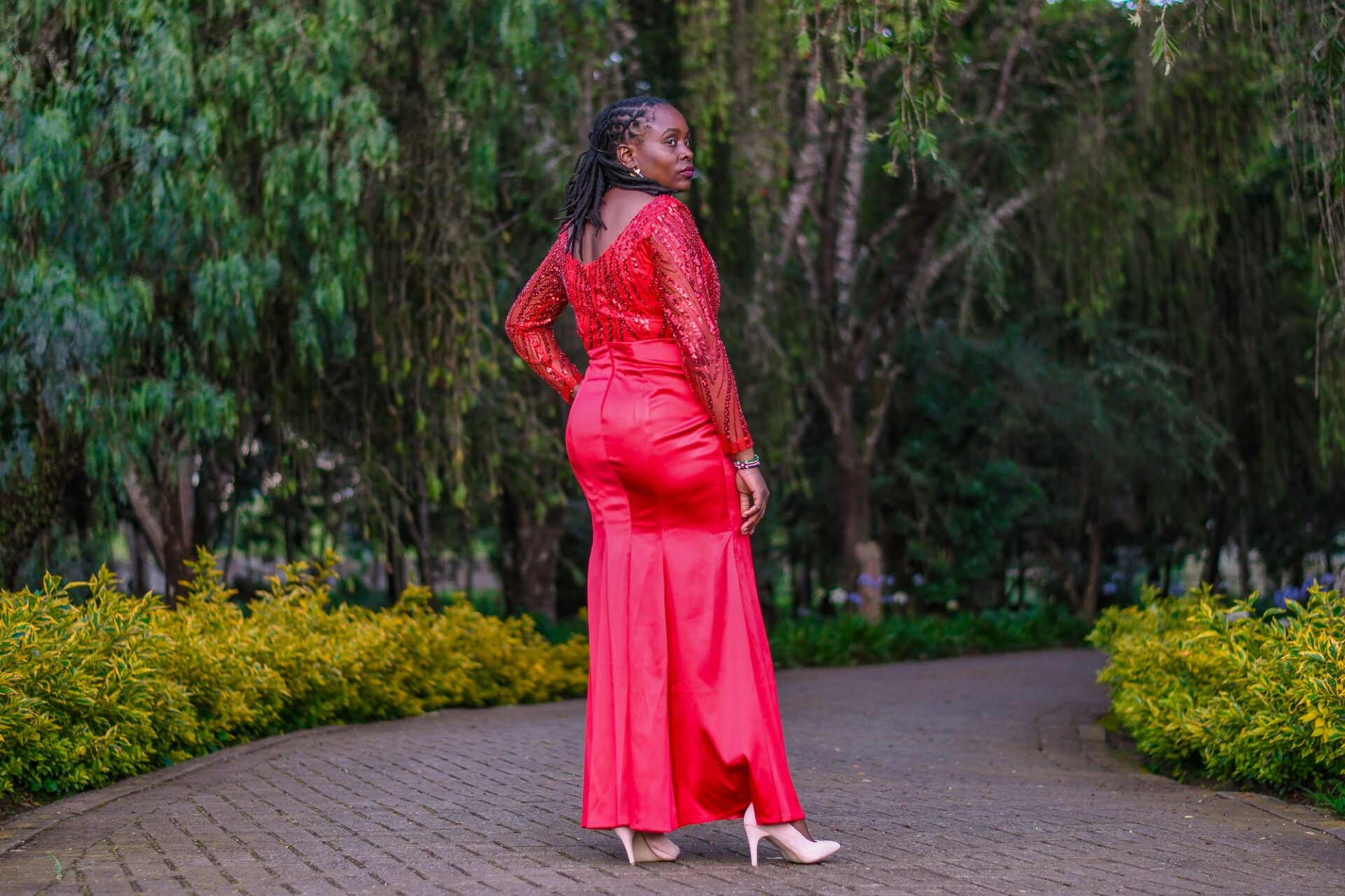 The Scarlet Beaded Gown exudes elegance with its detailed beadwork and luxurious fabric. Designed for special occasions, it guarantees a memorable entrance.