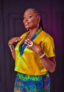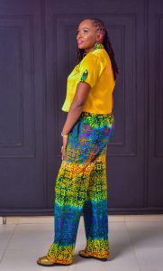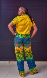 2-piece set with a cropped blouse with a V-neckline trimmed in a multicolored African print fabric that complements vivid patterned bottoms.